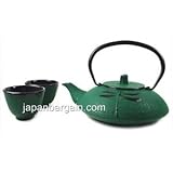 Green Dragonfly Cast Iron Tetsubin Tea Set -Designed by "Rikyu" -Holds up to 21 Fl. Oz. of Tea! -Inner Surface of the teapot and teacup is coated with black enamel. With proper care, this set shall last over generations. This set includes an Iron Teapot (Kettle), Two Iron Teacups, One Stainless Steel Mesh Tea Strainer; all inside a tan box making this set an excellent gift. Tetsubin or cast iron pots were first used throughout Japan as kettles to boil water over an open fire and were usually hung above a hearth to also provide heat and humidity in cold weather. In the mid 19th century, as infused teas such as Sencha became popular, brewing and serving the tea to friends and family in a tetsubin also became very popular. Benefits of Cast Iron Cookware: Cast iron ware is a boon for cooks since it heats evenly, retains heat well and lasts forever. It yields important health benefits, too! Iron-deficient diets are all too common these days and foods or liquids cooked in cast iron ware provide significant traces of this essential mineral. Long Term Care and Use (we recommend that you care for your tetsubin by following these guidelines): *Before first use, rinse your teapot several times with boiling water. But no soap! *Use the tetsubin to brew tea, not as a stove-top kettle. *Do not leave tea standing in the tetsubin for a long period of time. Dry both inside and outside of teapot completely 100% before storing or putting away otherwise it will rust. *Do not wash the tetsubin with abrasive pads or use harsh detergents or soaps. Simply rinse it with plain water and wipe it dry after each use. In Japan the natural mineral layer buildup inside a tetsubin is considered to be good for the health and helps to prevent rust from forming inside. *Do not expose your kettle or teapot to salt or oil. By following these guidelines your tetsubin will provide many years of enjoyment! Read more